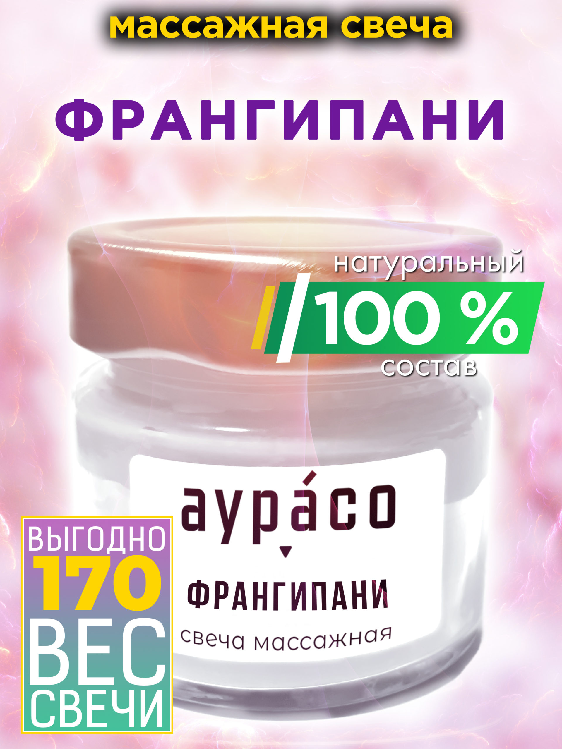 Франгипани — натуральное массажное масло, ароматическая массажная свеча Аурасо из 100 % соевого воска, крем-свеча натуральная, 170 гр, 1 шт.