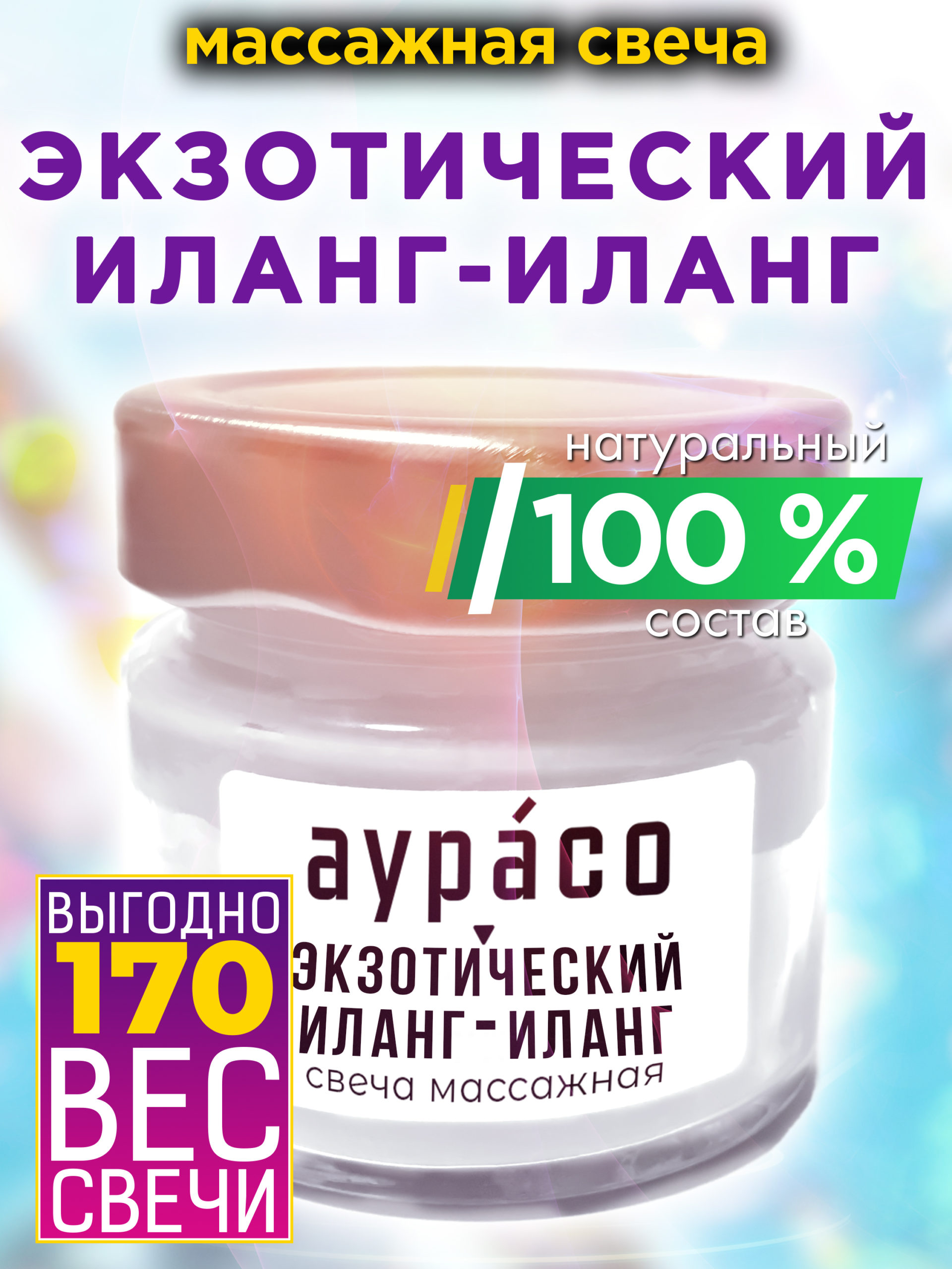 Компоненты в составе массажного масла Аурасо «Экзотический иланг-иланг» — это сбалансированный бальзам, который под воздействием огня превращается в тёплое масло. Свеча не содержит красителей.