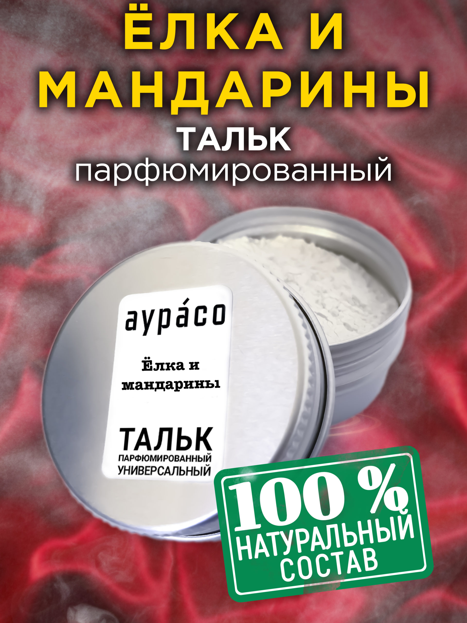 Натуральный ароматизированный тальк Аурасо для тела и ног с ароматом ‘Ёлка и мандарины’ обладает уникальной ароматической композицией, подходящей как для мужчин, так и для женщин.