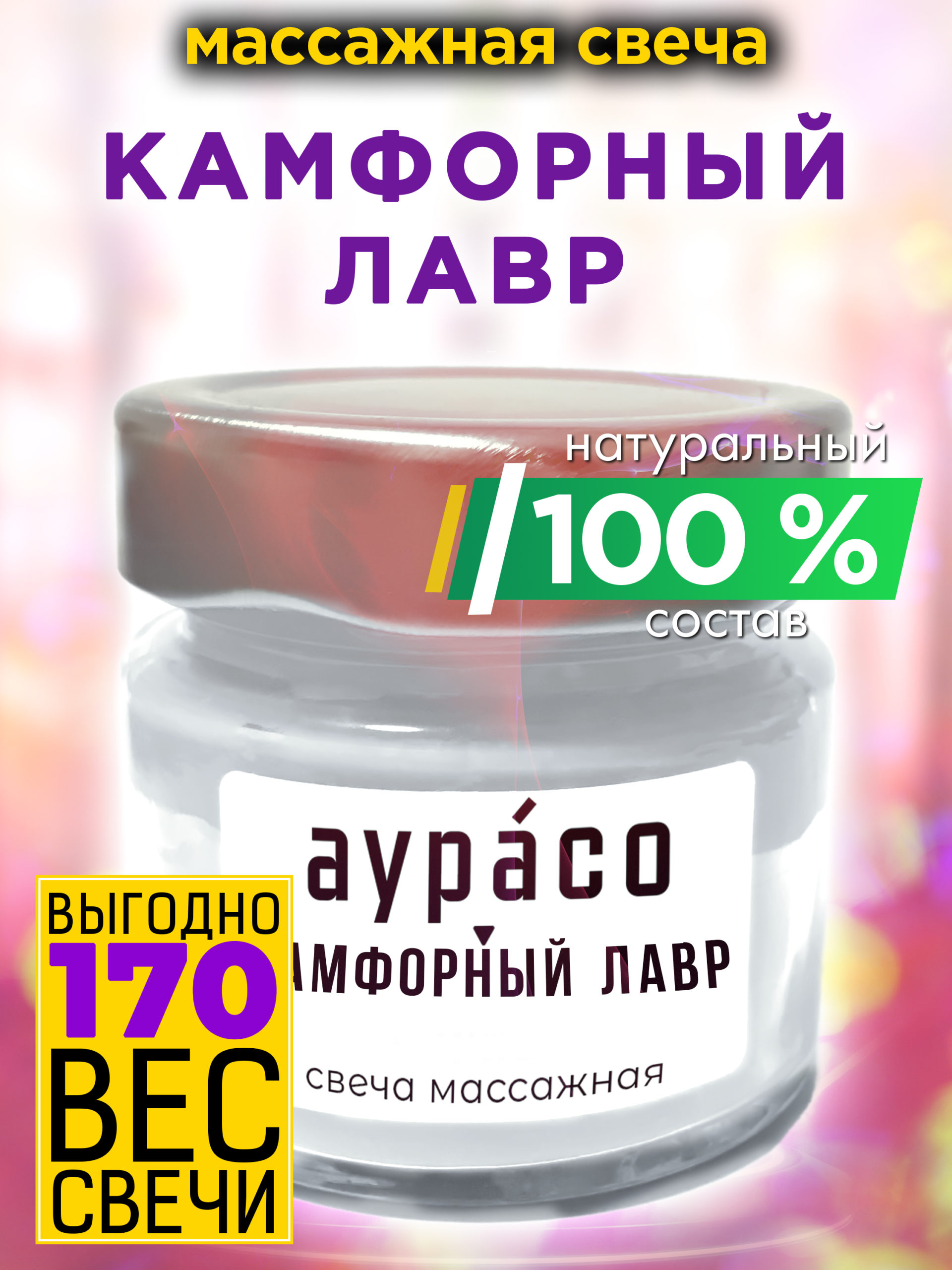 Камфорный лавр — натуральное массажное масло, ароматическая массажная свеча Аурасо из 100 % соевого воска, крем-свеча натуральная, 170 гр, 1 шт.