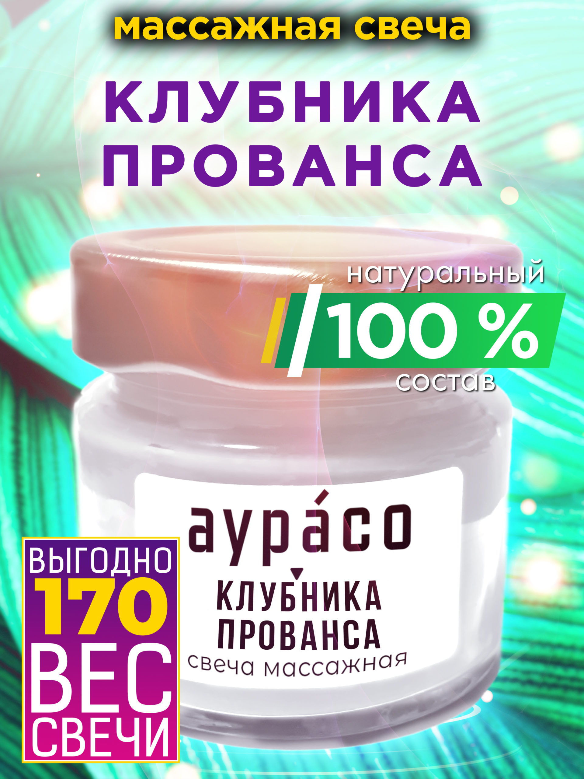 Компоненты в составе массажного масла Аурасо «Клубника Прованса» — это сбалансированный бальзам, который под воздействием огня превращается в тёплое масло. Свеча не содержит красителей.