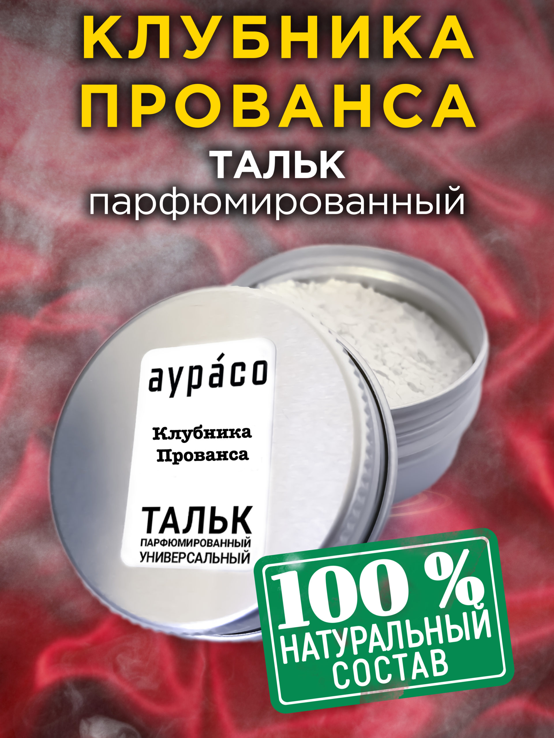 Натуральный ароматизированный тальк Аурасо для тела и ног с ароматом ‘Клубника Прованса’ обладает уникальной ароматической композицией, подходящей как для мужчин, так и для женщин.