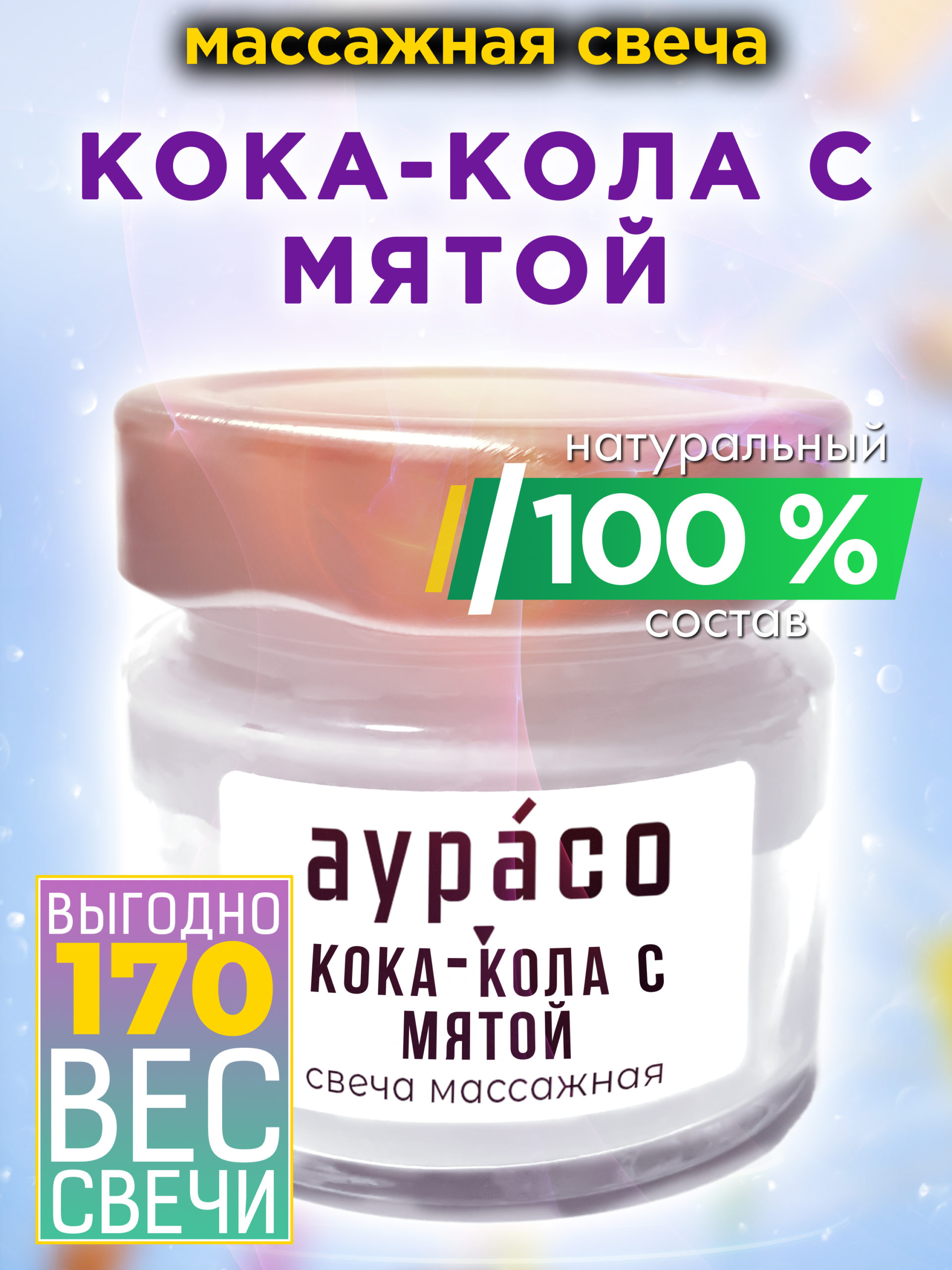 Кока-кола с мятой — натуральное массажное масло, ароматическая массажная свеча Аурасо из 100 % соевого воска, крем-свеча натуральная, 170 гр, 1 шт.