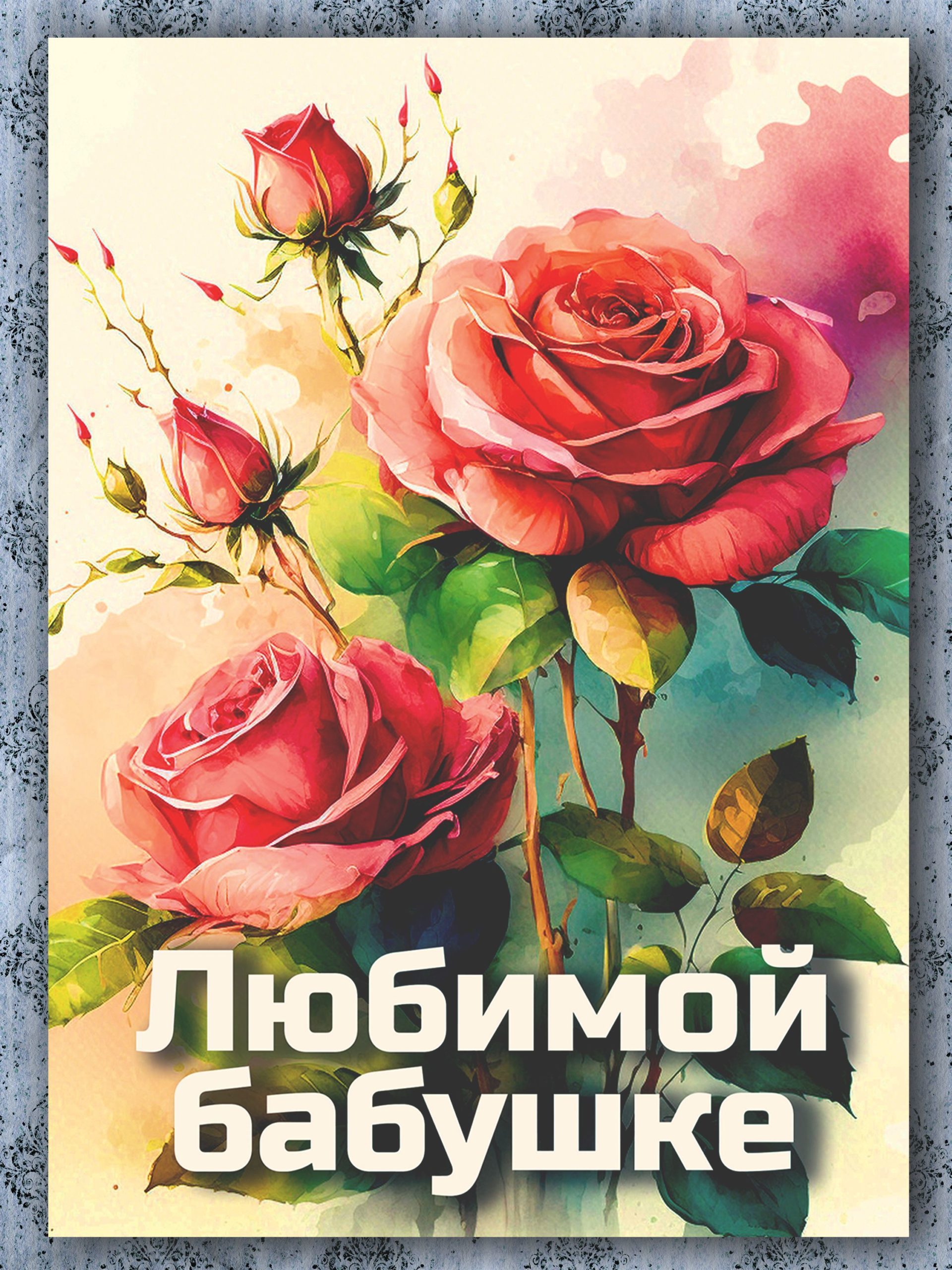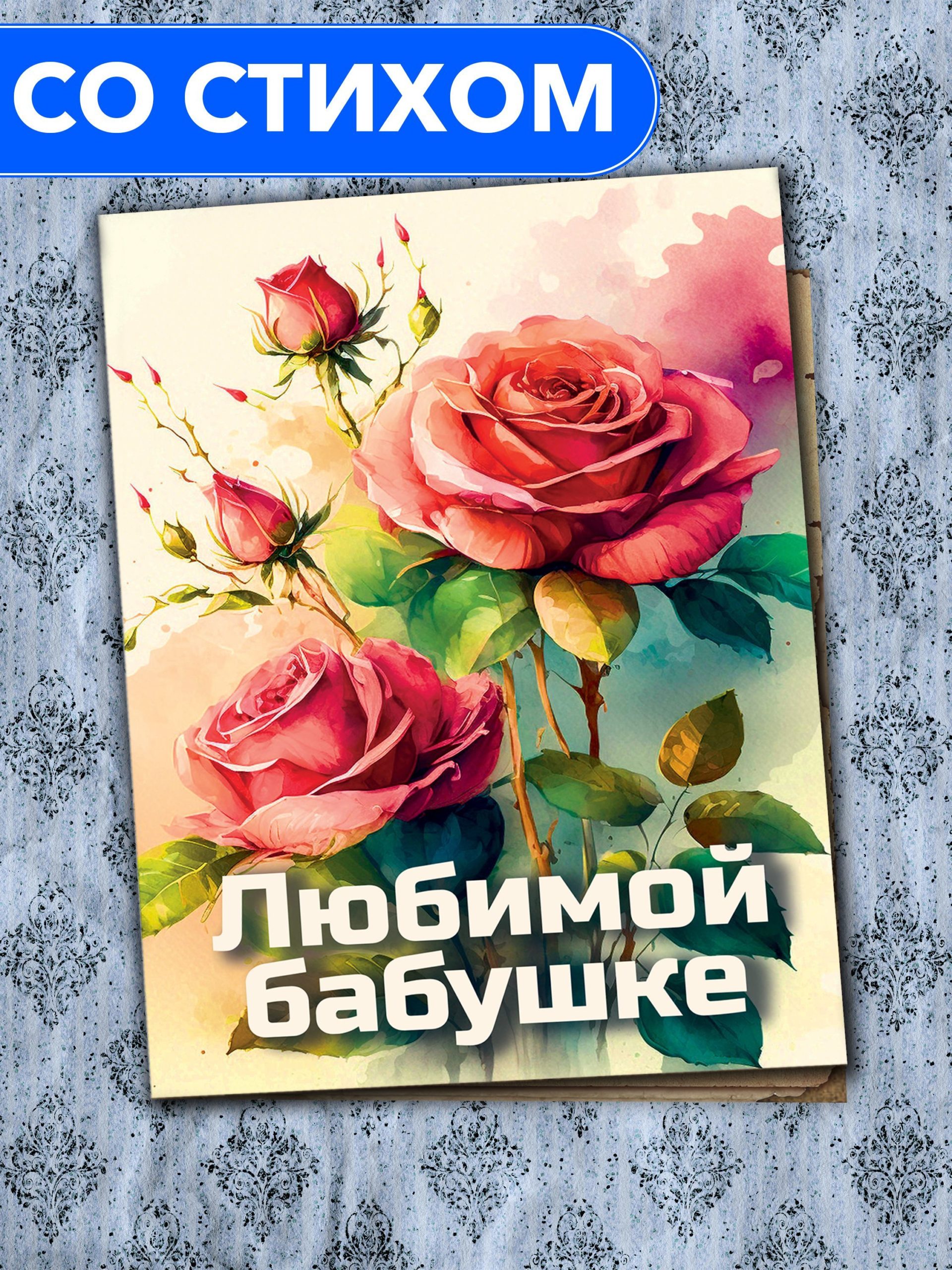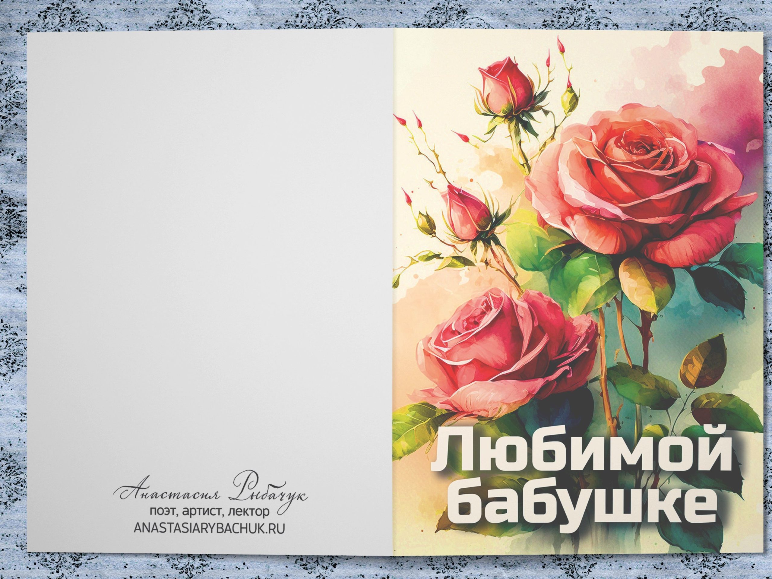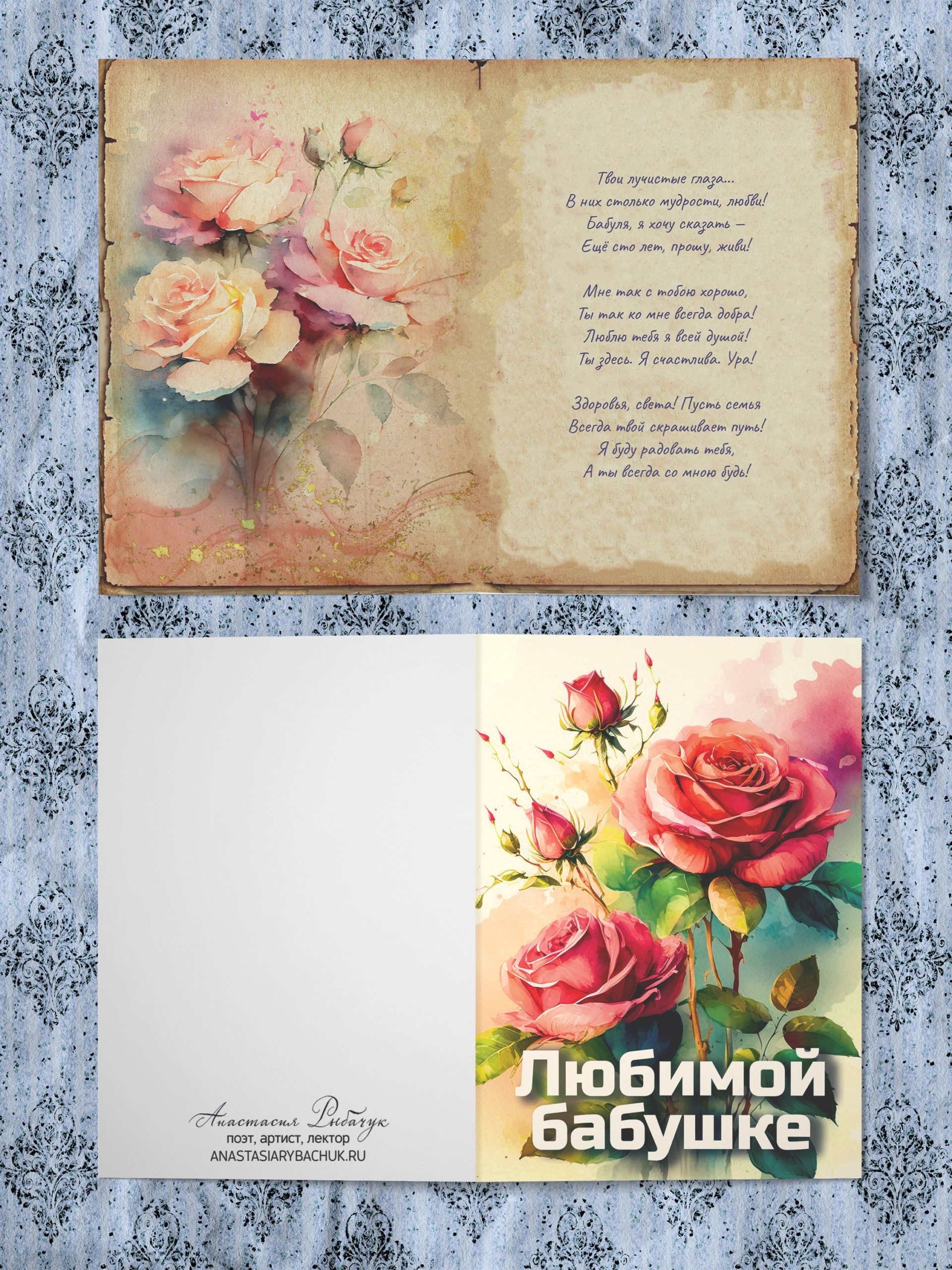 Поздравительная открытка «Любимой бабушке» из плотного мелованного картона 300 гр., с дизайнерским рисунком, в индивидуальной упаковке. Внутри открытки размещено оригинальное поздравительное стихотворение. Автор стихотворения: поэтесса и артистка Анастасия Рыбачук. На открытке изображены розы. Разворот открытки стилизован под винтаж. Формат: двусторонняя открытка с текстом внутри. Размер: А5 (148х210 мм). Открытка «Любимой бабушке» будет приятным, оригинальным и запоминающимся подарком бабушке на день рождения, именины, 8 Марта (Международный женский день).