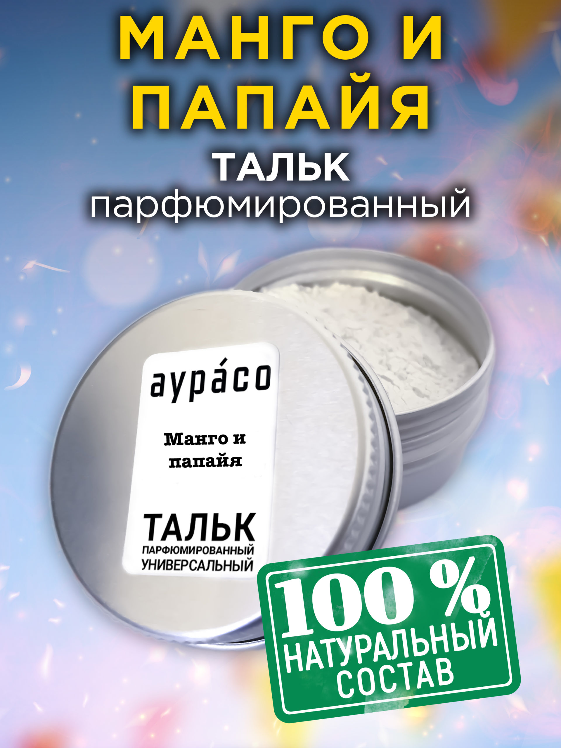 Натуральный ароматизированный тальк Аурасо для тела и ног с ароматом ‘Манго и папайя’ обладает уникальной ароматической композицией, подходящей как для мужчин, так и для женщин.