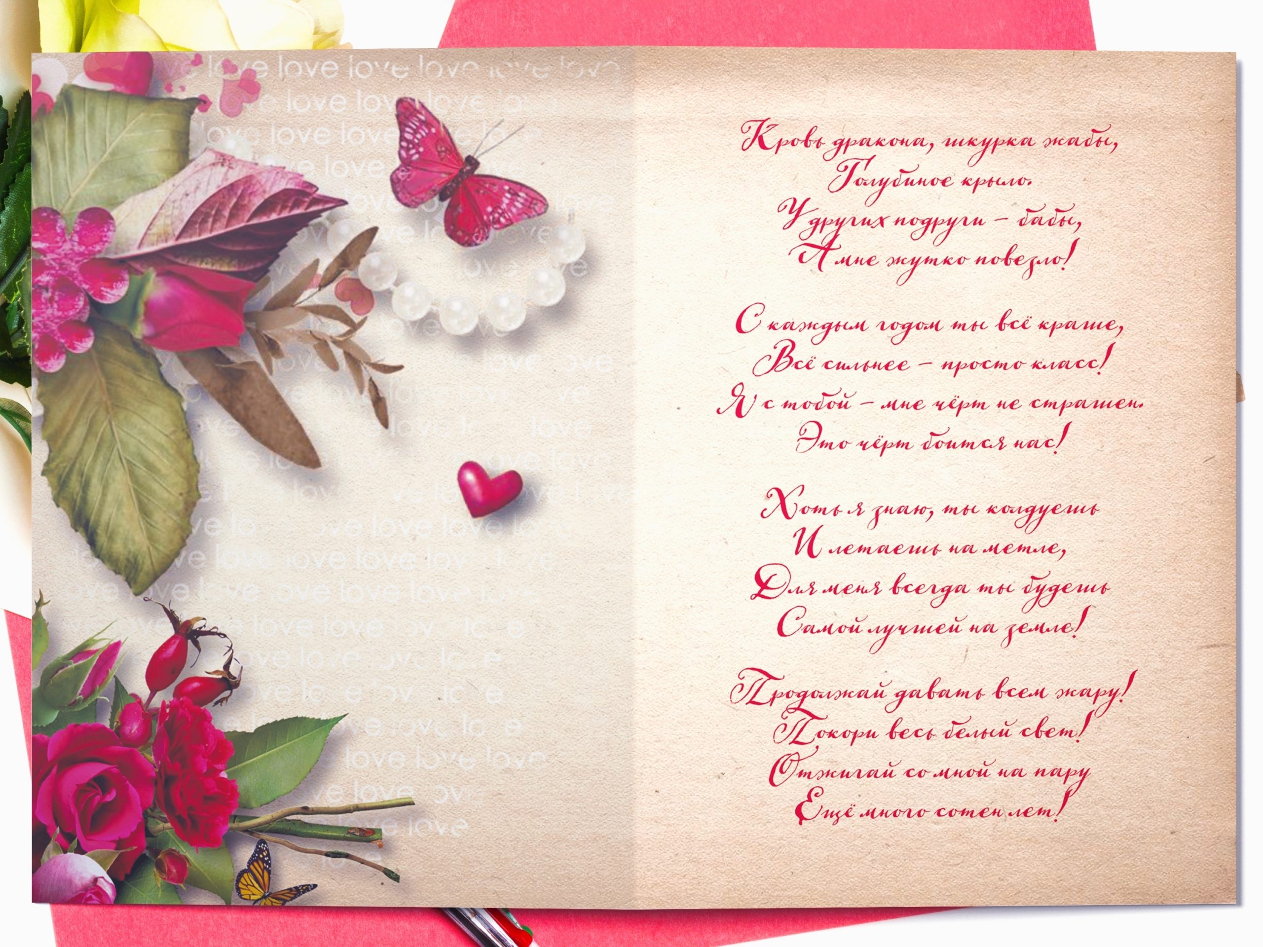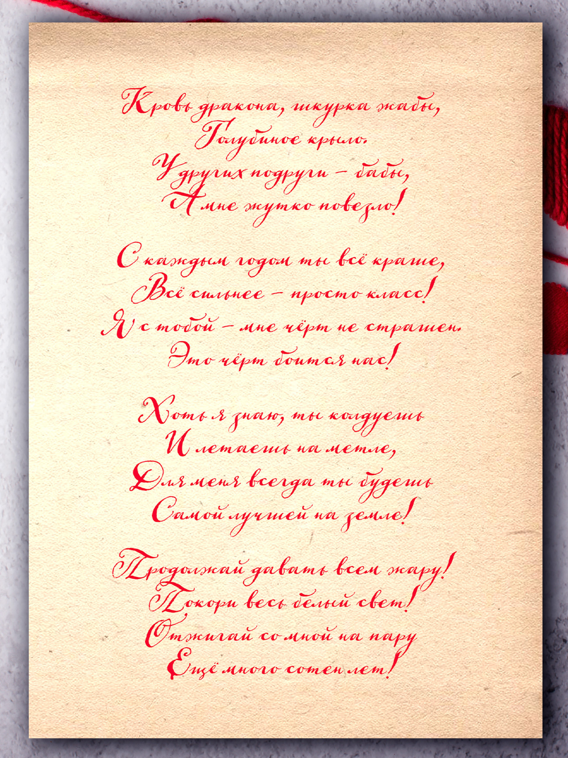 Большая авторская поздравительная открытка ведьме «Моей любимой ведьме» размера А5 (148х210 мм) из плотного мелованного картона 300 г/м², с дизайнерским рисунком, в индивидуальной упаковке. Внутри открытки размещено оригинальное поздравительное стихотворение ведьме. Автор стихотворения ведьме: поэтесса и артистка Анастасия Рыбачук — номинант Национальной литературной премии «Поэт года 2022», награждена медалью Марины Цветаевой и медалью Максима Горького за вклад в развитие русской литературы. Формат: двусторонняя литературная открытка со стихотворением ведьме внутри. Качественная многоцветная печать на плотном дизайнерском картоне создаёт впечатление, что изображение нарисовано акварелью. Каждая открытка перед отправкой проходит тщательный контроль качества. Открытка выглядит так же красиво, ярко и эффектно, как на фотографиях, а зачастую даже лучше. Открытка «Моей любимой ведьме» будет приятным, оригинальным, трогательным и запоминающимся на всю жизнь подарком ведьме на день рождения, именины, 8 Марта (Международный женский день).