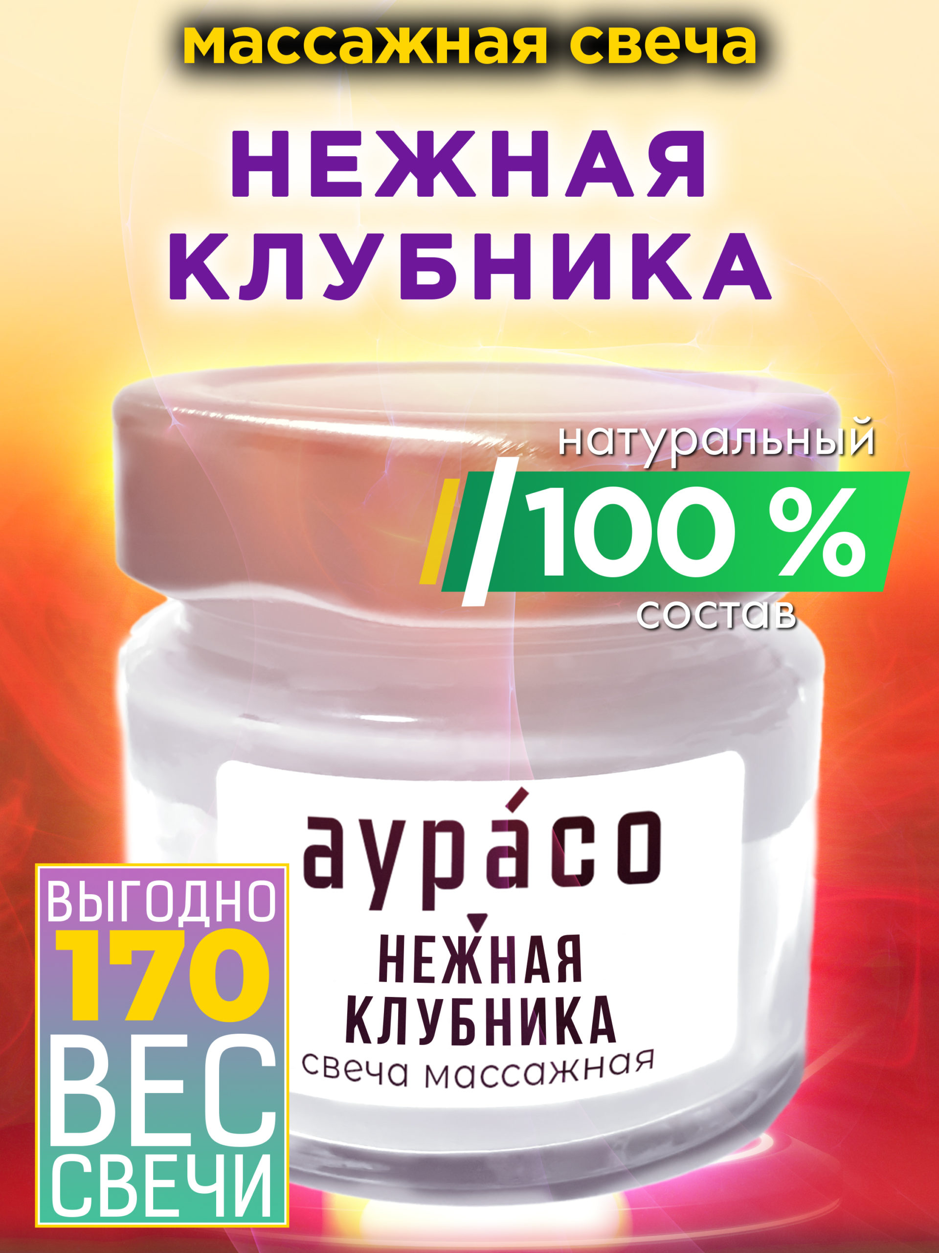 Компоненты в составе массажного масла Аурасо «Нежная клубника» — это сбалансированный бальзам, который под воздействием огня превращается в тёплое масло. Свеча не содержит красителей.