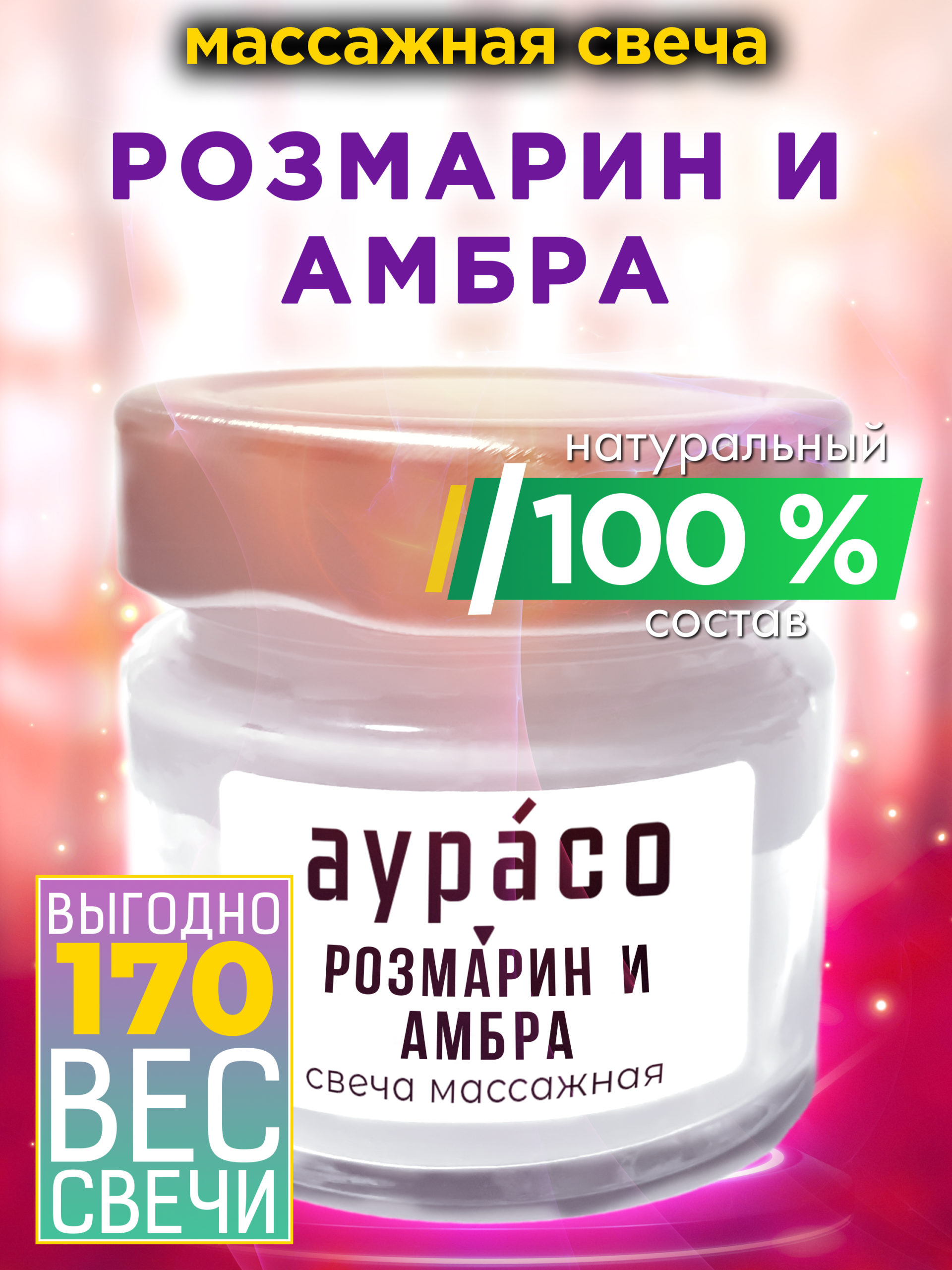Розмарин и амбра — натуральное массажное масло, ароматическая массажная свеча Аурасо из 100 % соевого воска, крем-свеча натуральная, 170 гр, 1 шт.