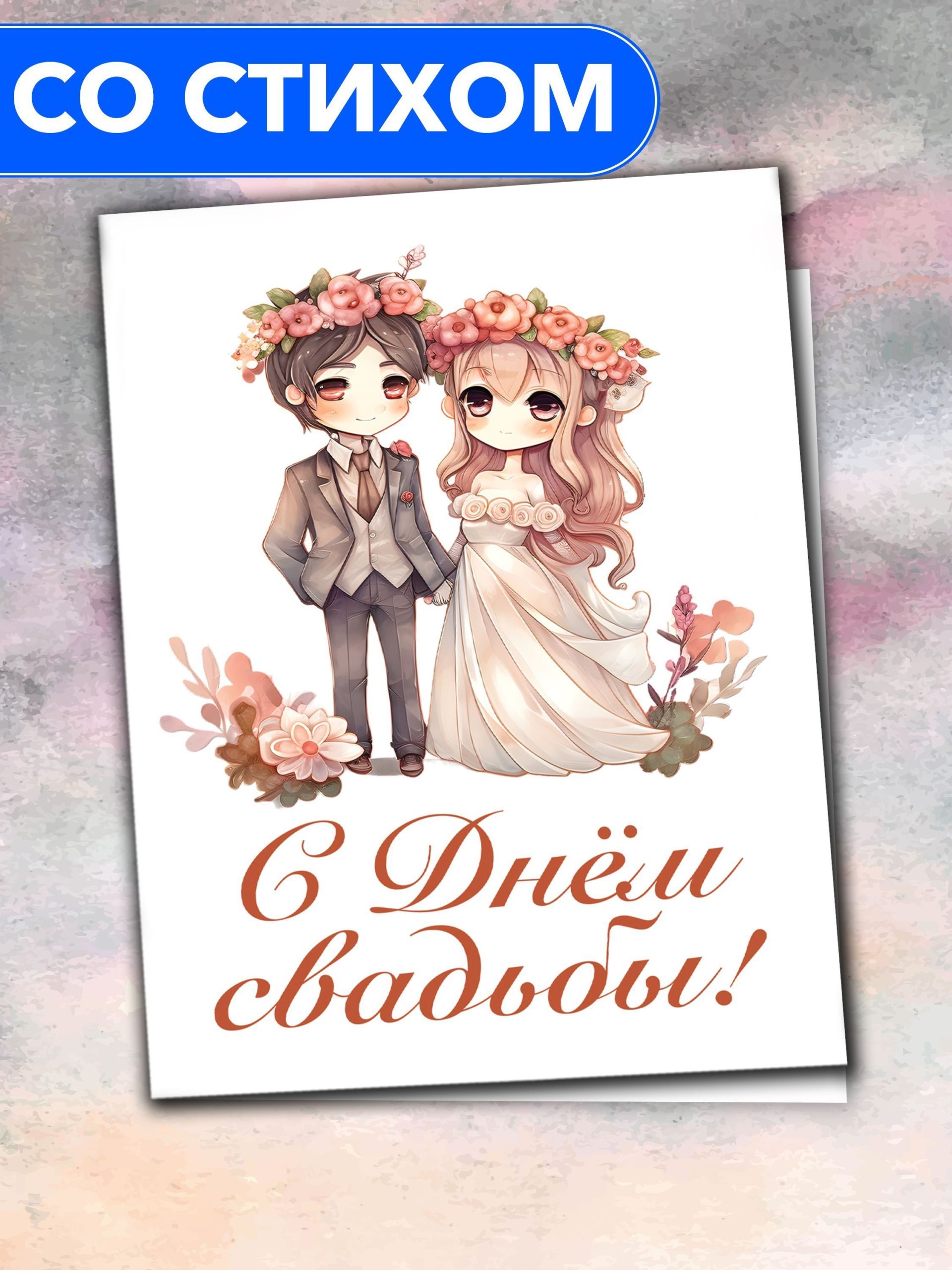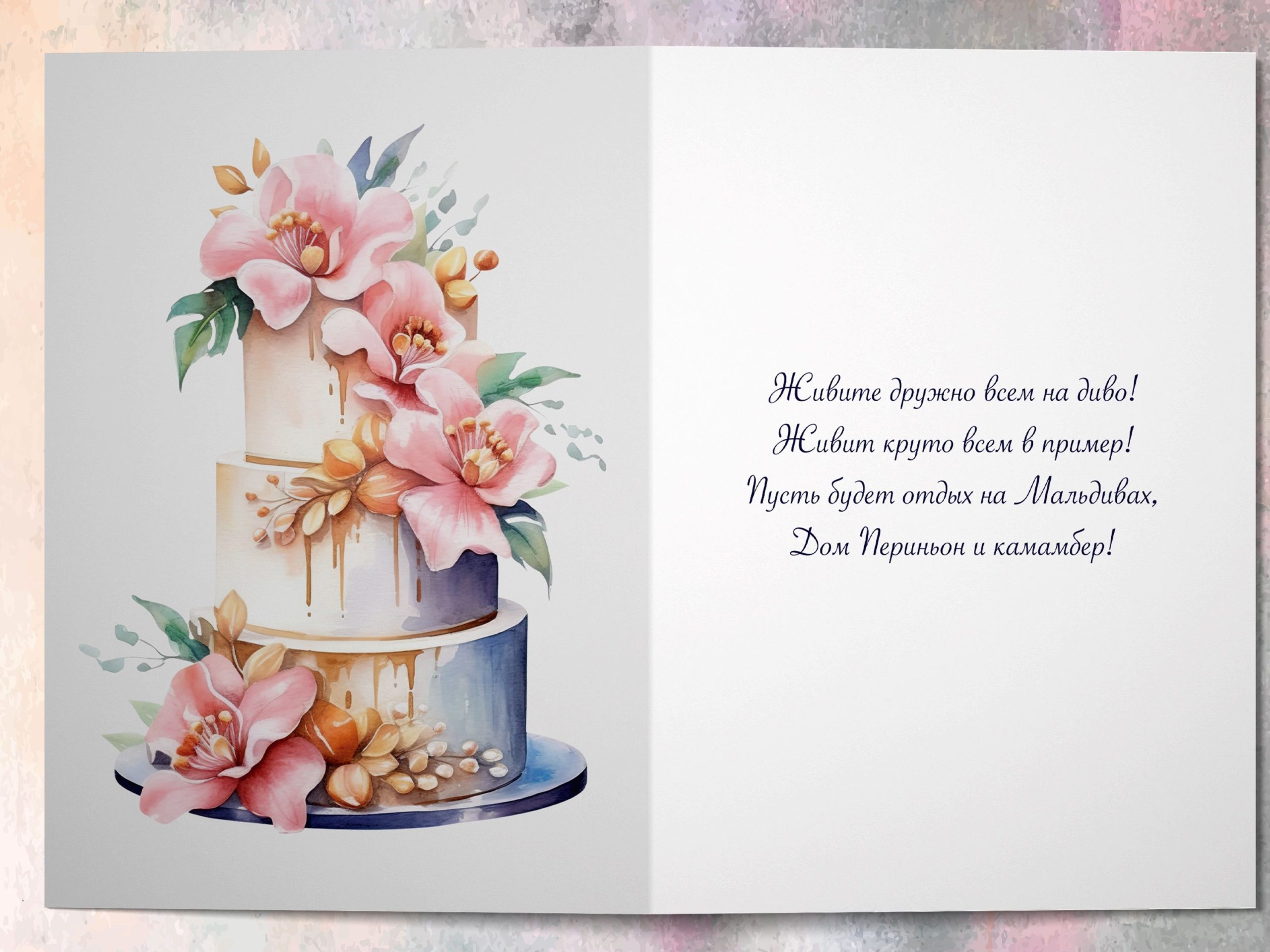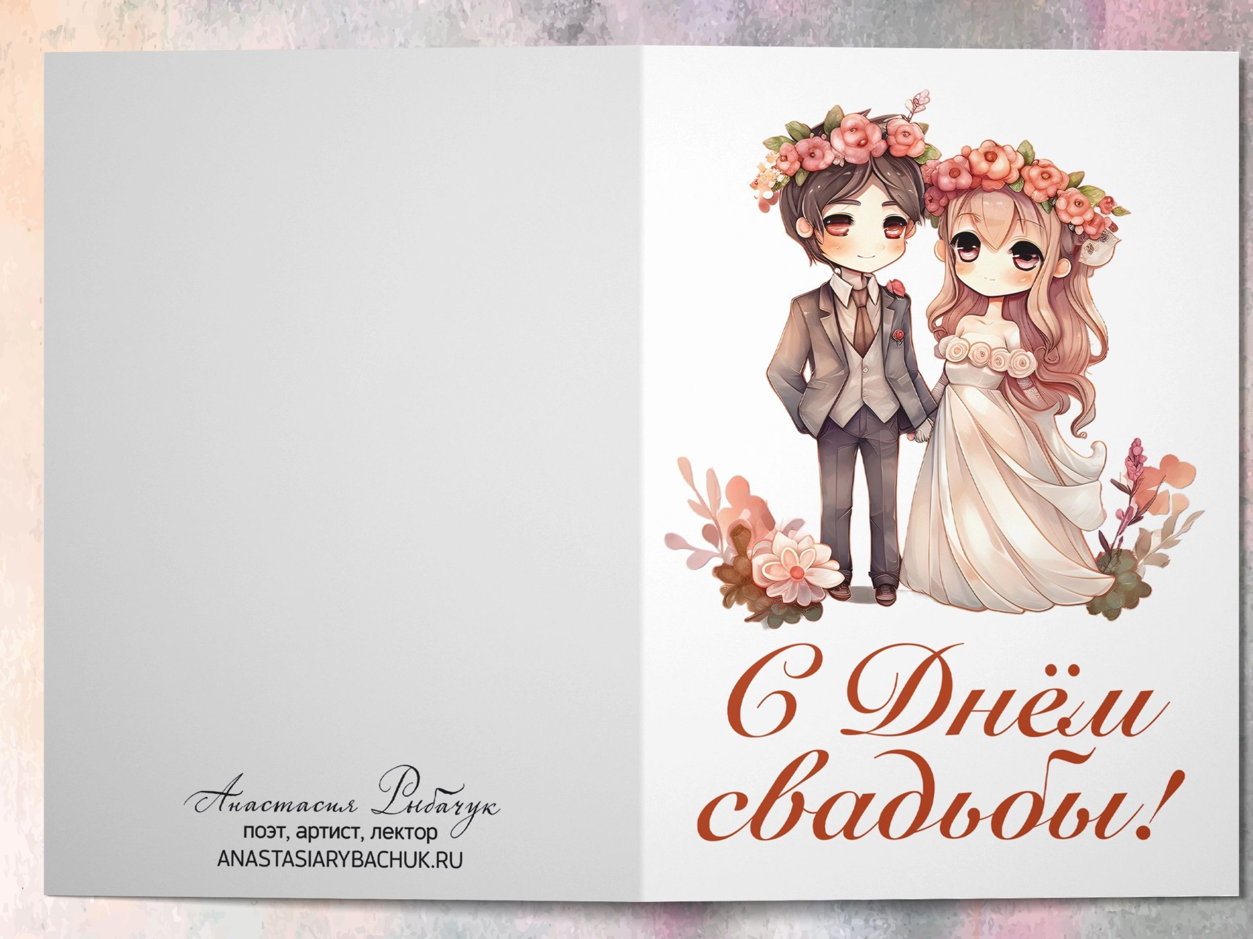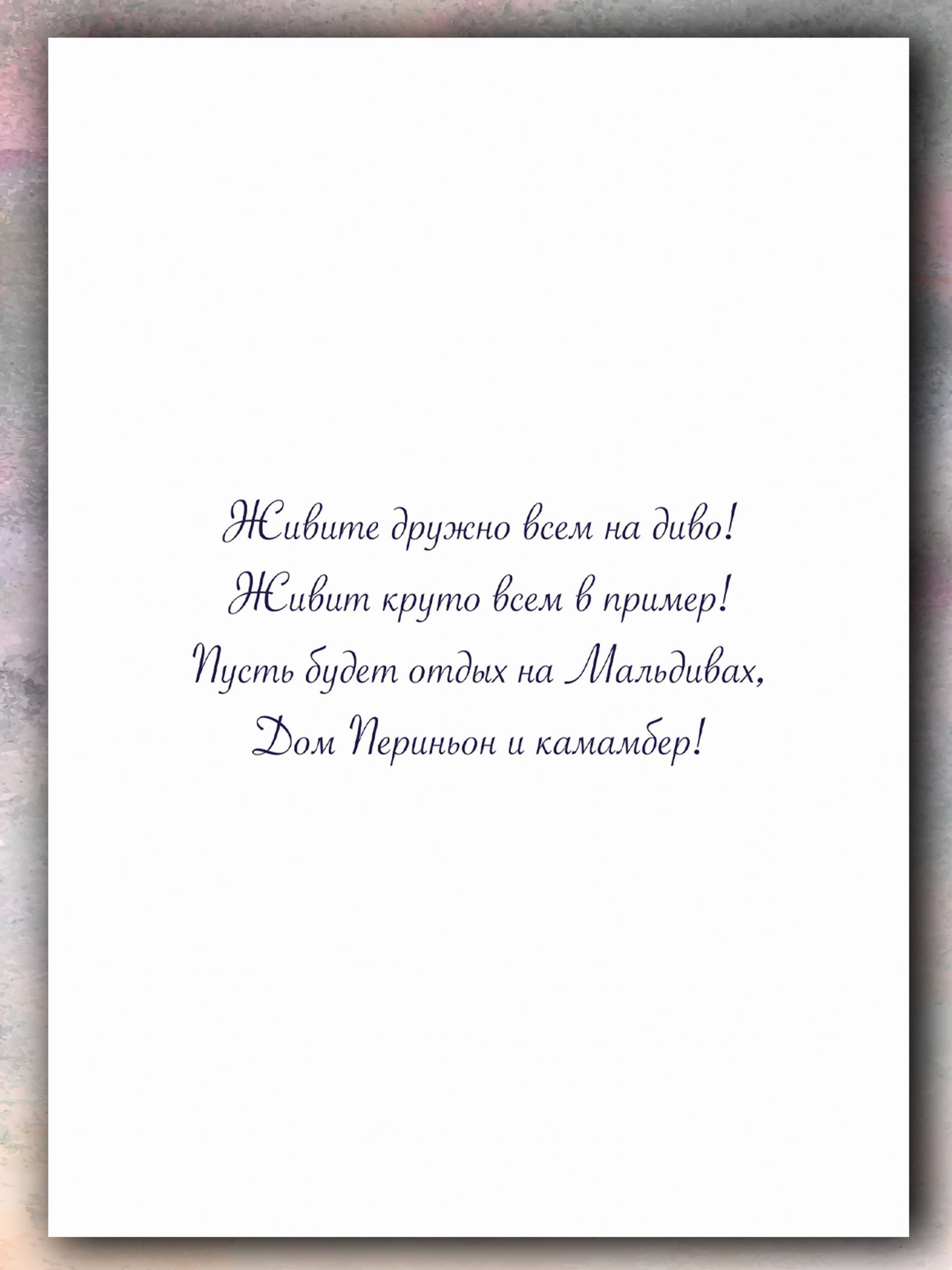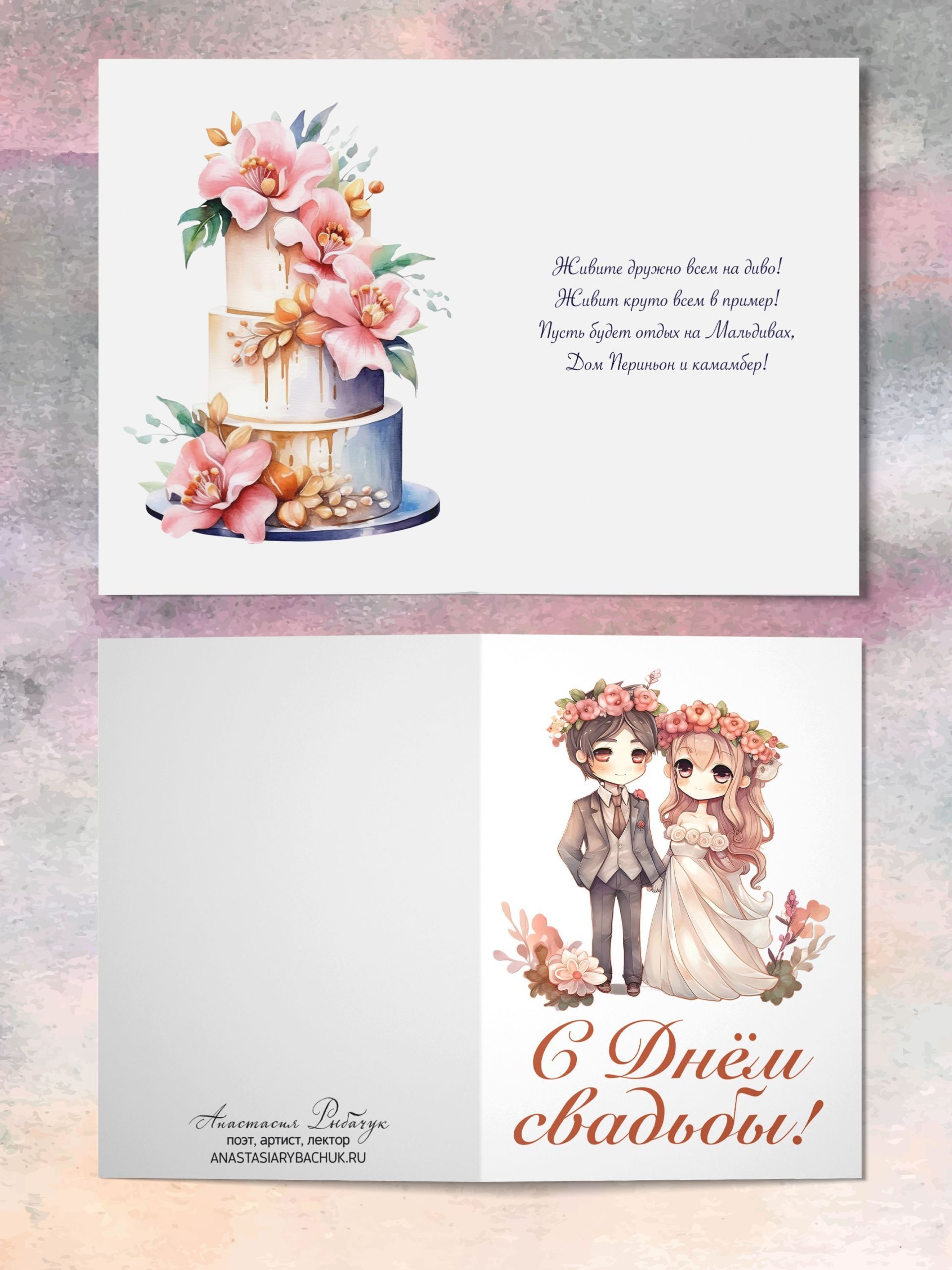 Большая авторская поздравительная открытка молодожёнам «С Днём свадьбы!» размера А5 (148х210 мм) из плотного мелованного картона 300 г/м², с дизайнерским рисунком, в индивидуальной упаковке. Внутри открытки размещено оригинальное поздравительное стихотворение жениху и невесте. Автор стихотворения молодожёнам: поэтесса и артистка Анастасия Рыбачук — номинант Национальной литературной премии «Поэт года 2022», награждена медалью Марины Цветаевой и медалью Максима Горького за вклад в развитие русской литературы. Формат: двусторонняя литературная открытка «С Днём свадьбы!» со стихотворением внутри. Качественная многоцветная печать на плотном дизайнерском картоне создаёт впечатление, что изображение нарисовано акварелью. Каждая открытка «С Днём свадьбы!» перед отправкой проходит тщательный контроль качества. Открытка выглядит так же красиво и эффектно, как на фотографиях, а зачастую даже лучше. Открытка «С Днём свадьбы!» упакована в прозрачную индивидуальную упаковку и в упаковку, содержащую внутри пузырчатую плёнку, которая максимально защищает открытку при транспортировке. Вместе с открыткой «С Днём свадьбы!» в комплектации идёт большой конверт размера А5 (148х210 мм). Открытка «С Днём свадьбы!» будет приятным, трогательным, оригинальным и запоминающимся на всю жизнь подарком жениху и невесте на свадьбу.