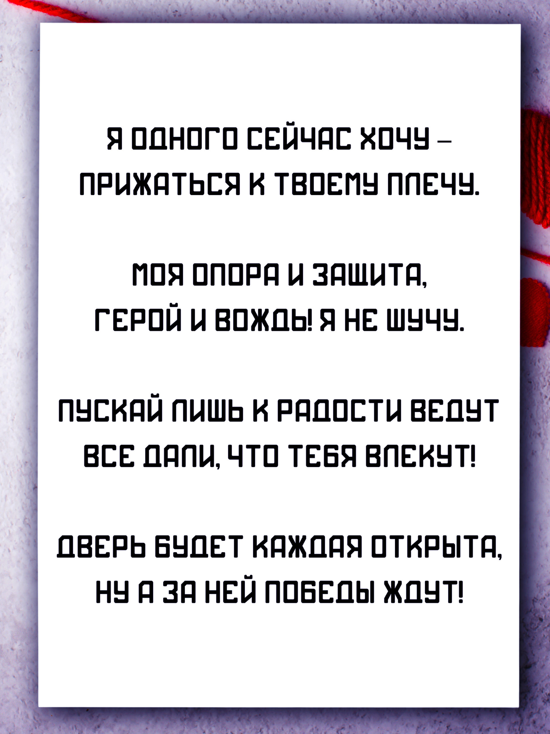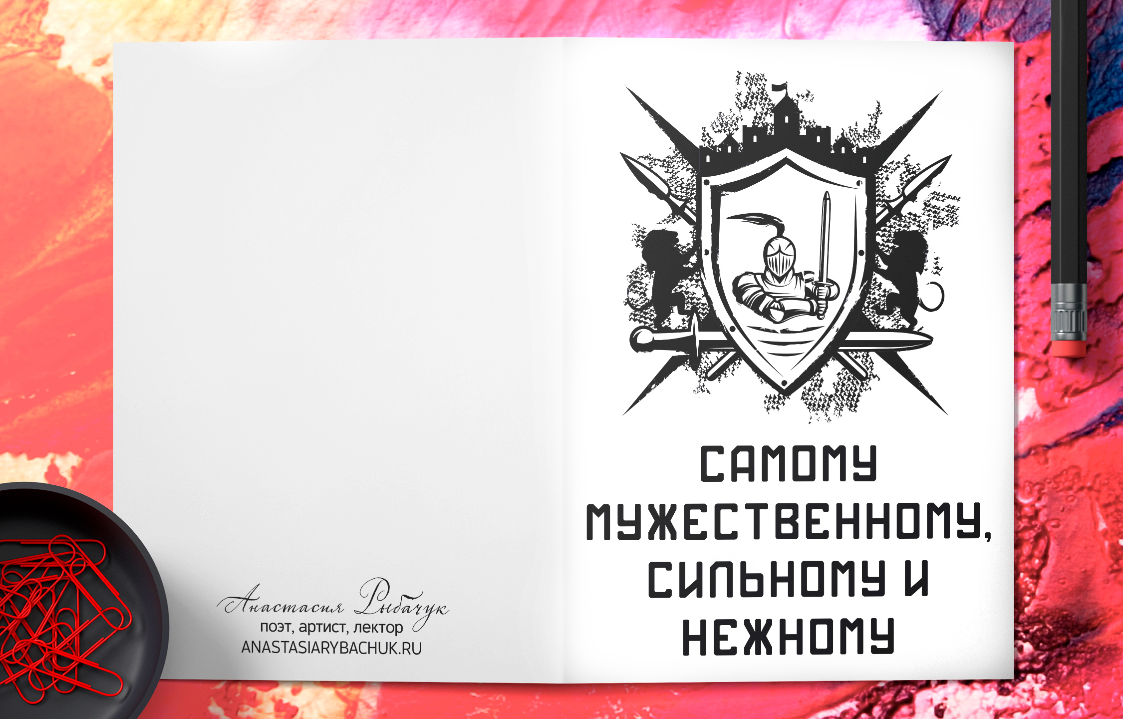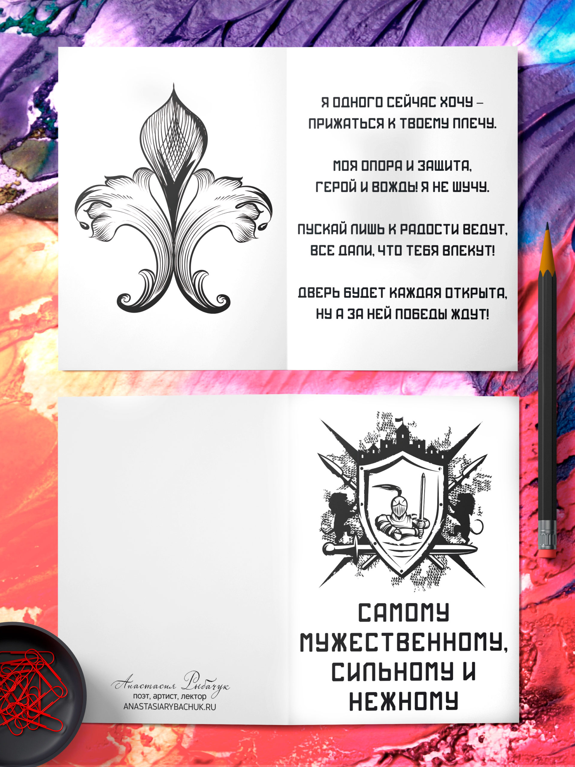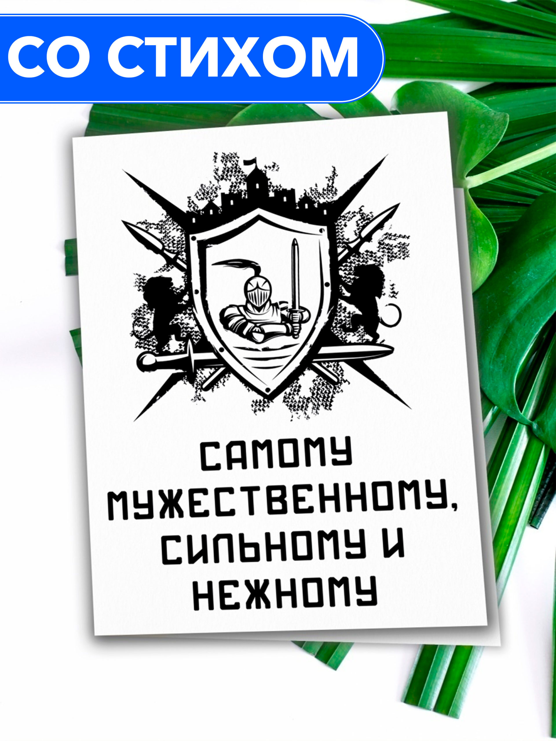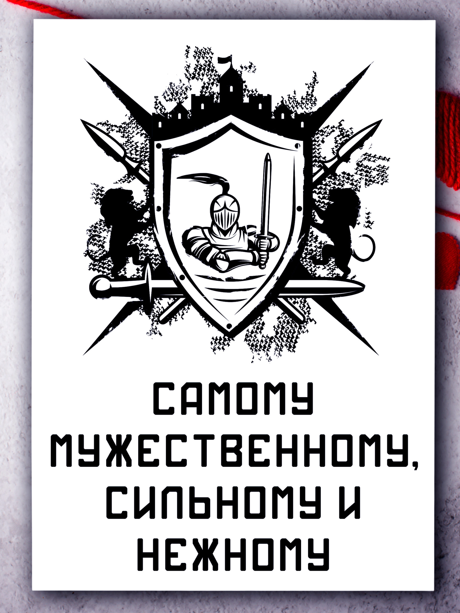 Поздравительная открытка из плотного мелованного картона 300 гр., с дизайнерским рисунком, в индивидуальной упаковке. Внутри открытки размещено поздравительное стихотворение. Автор стихотворения: поэтесса и артистка Анастасия Рыбачук. На открытке изображены элементы рыцарской символики. Обложка открытки покрыта глянцевым слоем ламинации. На внутренней стороне открытки ламинации нет, чтобы туда можно было вписать имена. Формат: двусторонняя открытка с текстом внутри. Размер: А5 (148х210 мм). Открытка «Самому мужественному, сильному и нежному» будет приятным, оригинальным и запоминающимся подарком на день рождения, годовщину свадьбы, 14 февраля (День святого Валентина, или День всех влюбленных), 23 февраля (День защитника Отечества) парню, мужчине, другу, любимому, мужу.