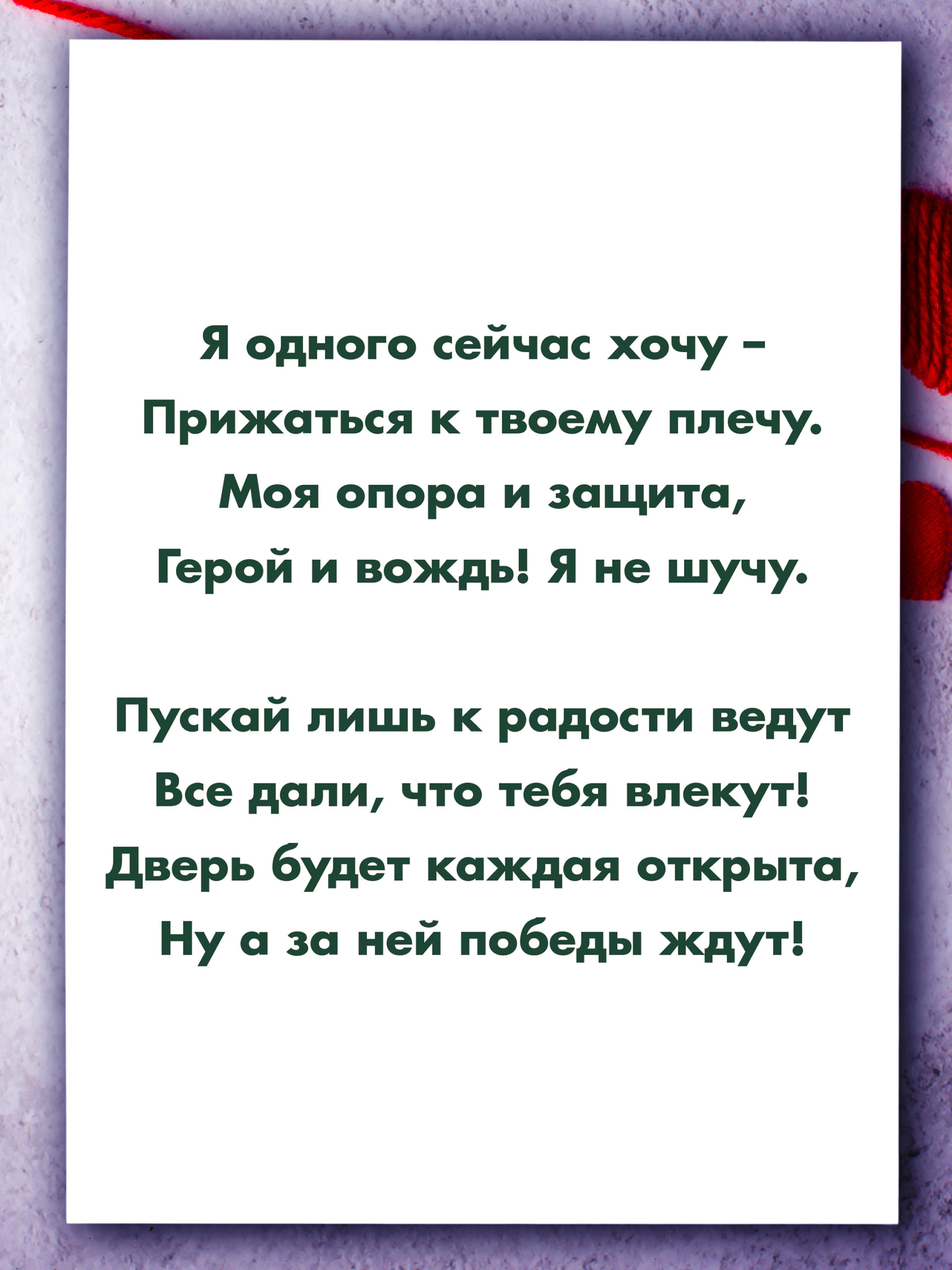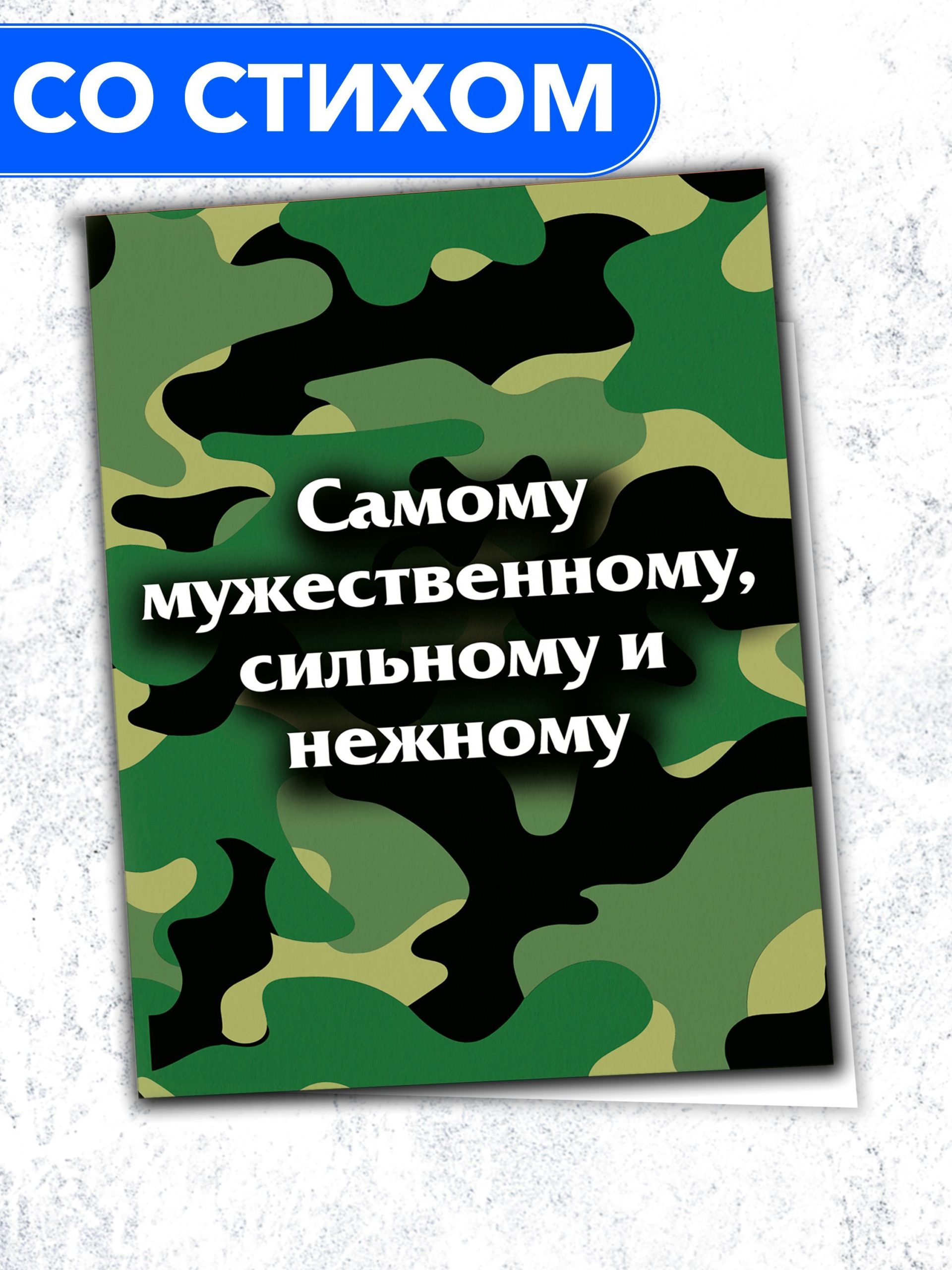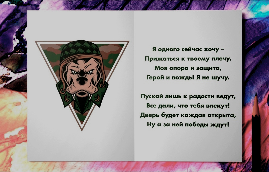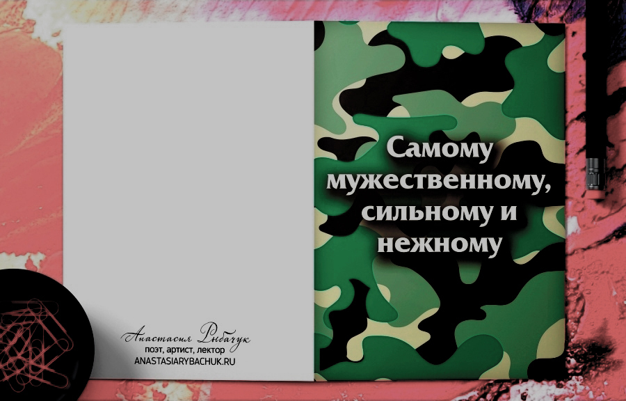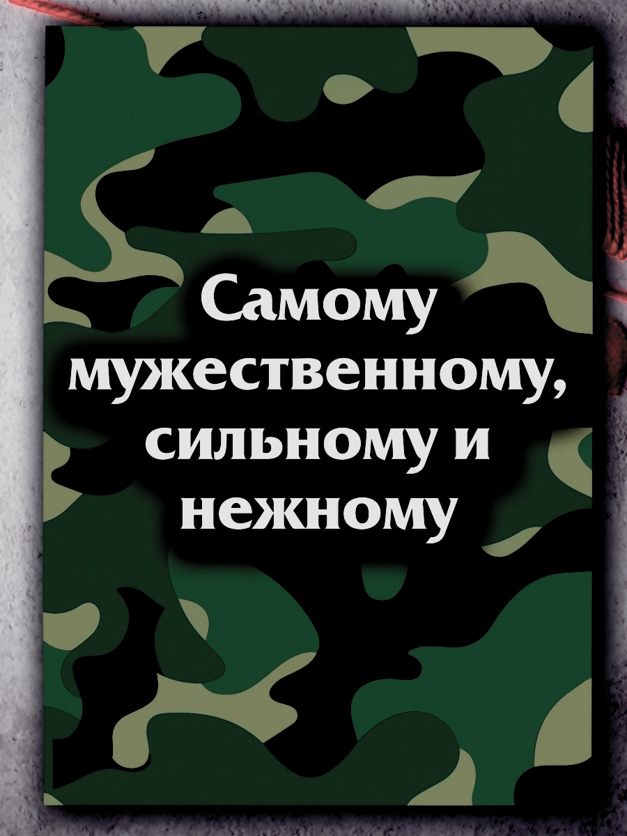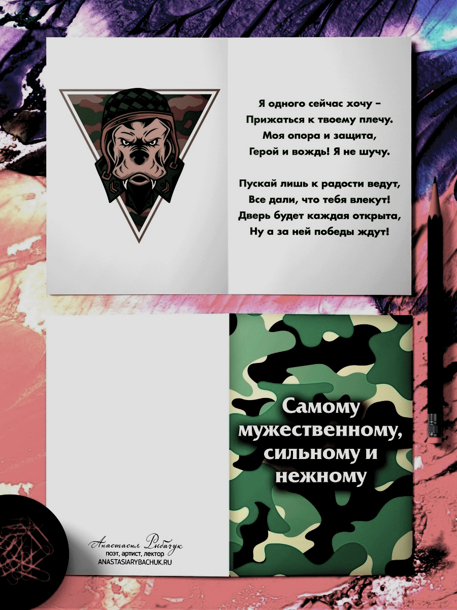 Поздравительная открытка из плотного мелованного картона 300 гр., с дизайнерским рисунком, в индивидуальной упаковке. Внутри открытки размещено оригинальное поздравительное стихотворение. Автор стихотворения: поэтесса и артистка Анастасия Рыбачук. На обложке открытки размещён принт в стиле милитари, а на внутренней стороне – стилизованный бульдог в военной каске. Обложка открытки покрыта глянцевым слоем ламинации. На внутренней стороне открытки ламинации нет, чтобы туда можно было вписать имена. Формат: двусторонняя открытка с текстом внутри. Размер: А5 (148х210 мм). Открытка «Самому мужественному, сильному и нежному» будет приятным, оригинальным и запоминающимся подарком на день рождения, годовщину свадьбы, 14 февраля (День святого Валентина, или День всех влюбленных), 23 февраля (День защитника Отечества) парню, мужчине, другу, любимому, мужу.