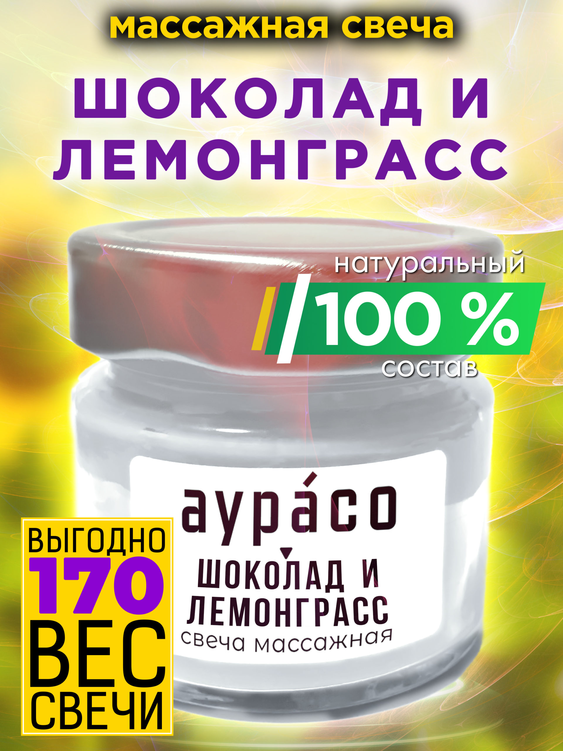 Шоколад и лемонграсс — натуральное массажное масло, ароматическая массажная свеча Аурасо из 100 % соевого воска, крем-свеча натуральная, 170 гр, 1 шт.